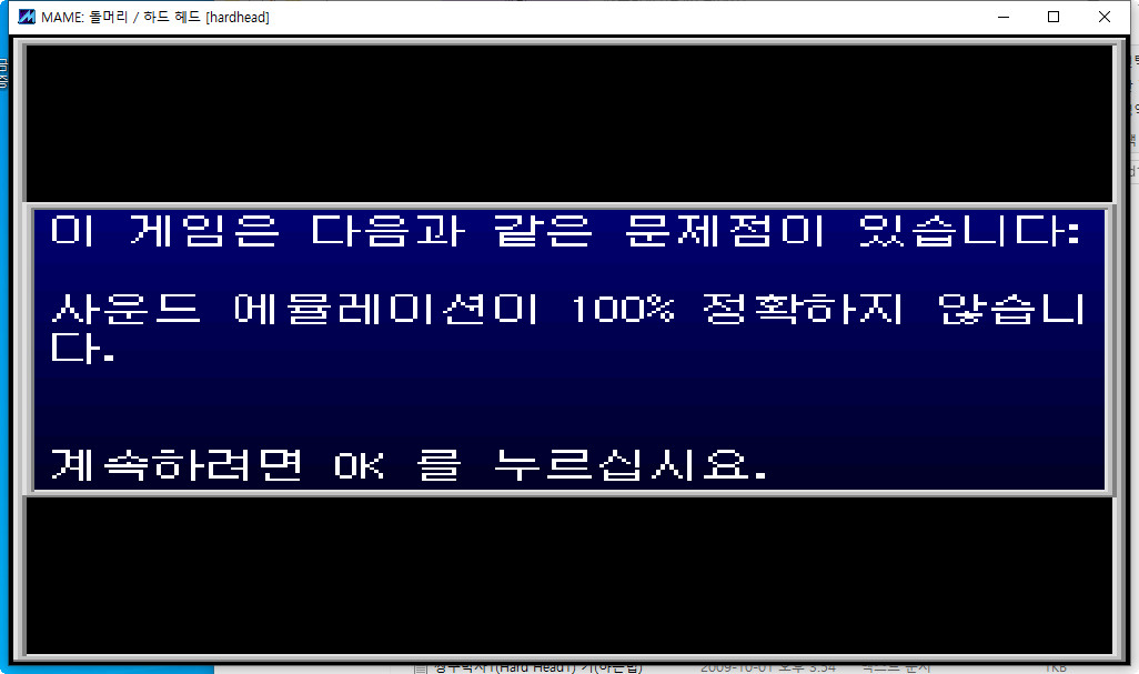 처음에 시작할 때 "이 게임은 다음과 같은 문제점이 있습니다. 사운드 에뮬레이션이 100% 정확하지 않습니다."라는 문구가 나옵니다. 이때 키보드로 OK 버튼을 눌러주면 테스트가 통과되어 게임이 정상적으로 시작됩니다.